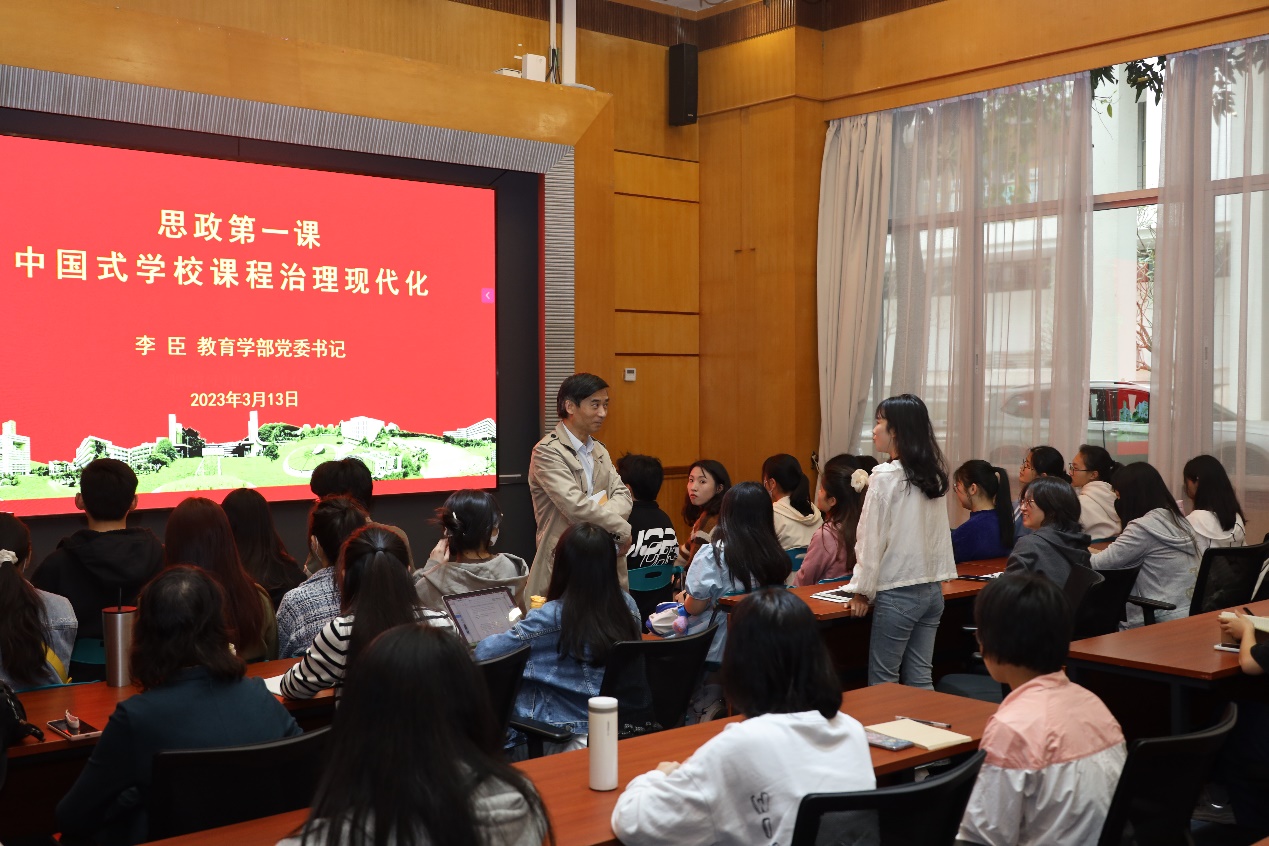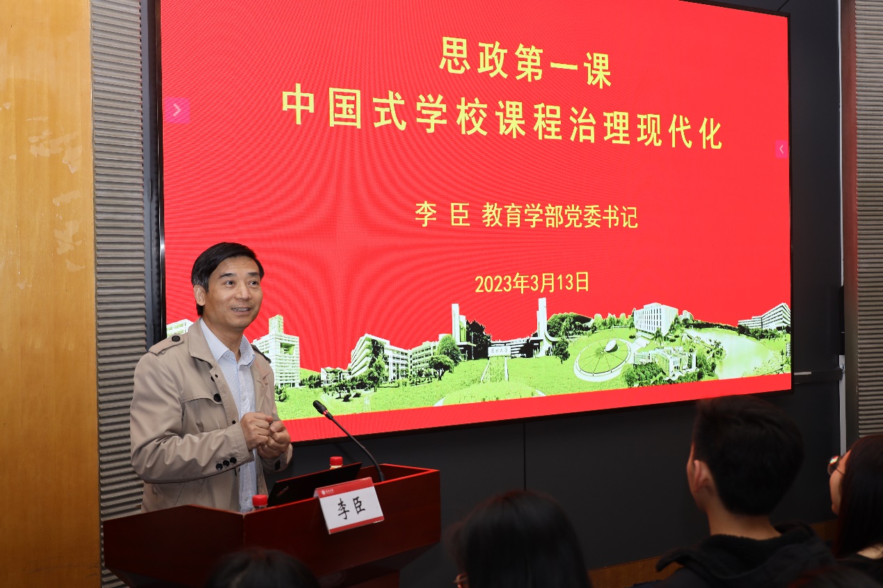 为深入学习贯彻党的二十大精神,落实教育部等十部门《全面推进“大思政课”建设的工作方案》精神。3月13日教育学部党委书记李臣教授以“中国式学校课程治理现代化”为主题的“思政第一课”在国际会议厅D厅顺利举行,共计130余名本科生、研究生、教师参加会议。