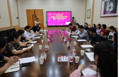 教师代表在国际会议厅A厅与中国人民大学党委学生工作部副部长袁世琨、外国语学院党委副书记李佳伟、信息资源管理学院党委副书记韩曙光等一行人交流座谈。 座谈会由黄佳主持。