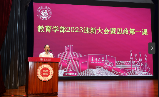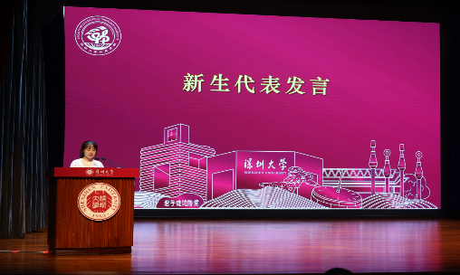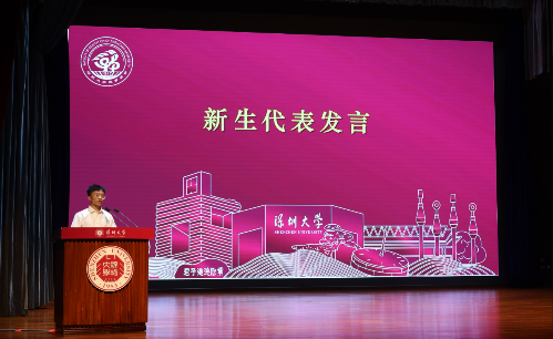 学前教育专业邓丹丹代表研究生新生发言,她表示,“我们拥有了一个共同的身份:深大人!这一份录取通知书,承载了太多的努力与汗水,更承载了我们太久的殷切希望。今天,一切都不再是梦想。”教育技术学专业于杨朔代表本科新生发言,他表示,“丰富的社团活动,优秀的教师团队,浓厚的学习氛围,让每一个来到深大的学子,都可以找到灵魂诗意的栖居地。未来四年的大学生活,我们有更多的机会、更好的环境,去探索成为更好的自己。”