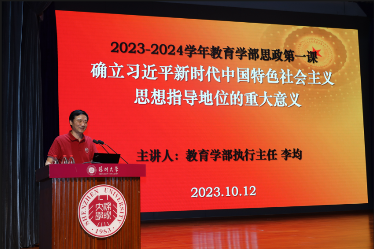 执行主任李均教授在国际会议厅开讲主题为“确立习近平新时代中国特色社会主义思想指导地位的重大意义”的思政第一课,旨在引导同学们深入学习领会党的二十大精神,对于确立习近平新时代中国特色社会主义思想指导地位的重大意义,并了解新时代新征程中国共产党的使命任务。学部300余名本科生、研究生全程参与。