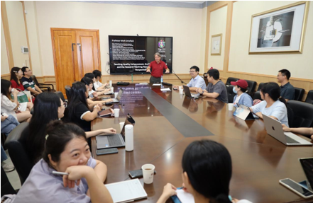 师生带来三场《提高教学质量、追求卓越与研究教学的关系:反思与观点》《行动研究与实践发展》和《支持主动学习的工具包》讲座。讲座从课堂教学研究实践出发,生动有趣的讲解了提升教学质量、小组式行动研究设计、支持主动学习的案例与理念,赢得师生阵阵掌声。 首场讲座中,斯科菲尔德教授分享了大学如何通过构建“五个R”- Reputation(声誉), Recruitment(招生), Retention(师生巩固率), Research(科研),Relationships(关系)的正向循环,并利用教师发展培训、教学质量管理、教学研究、教师激励政策、学生支持体系、教学资源的六大支柱,促进教师努力追求卓越教学的经验与反思。