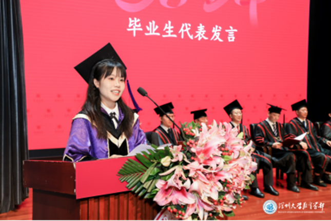 2021级硕士研究生郑涵作为毕业研究生代表发言。她细数了在深大的三年读研时光,“帽穗从右到左、拨去匆匆岁月,拨去昨日青涩。”但无论去往何方,在成人游戏