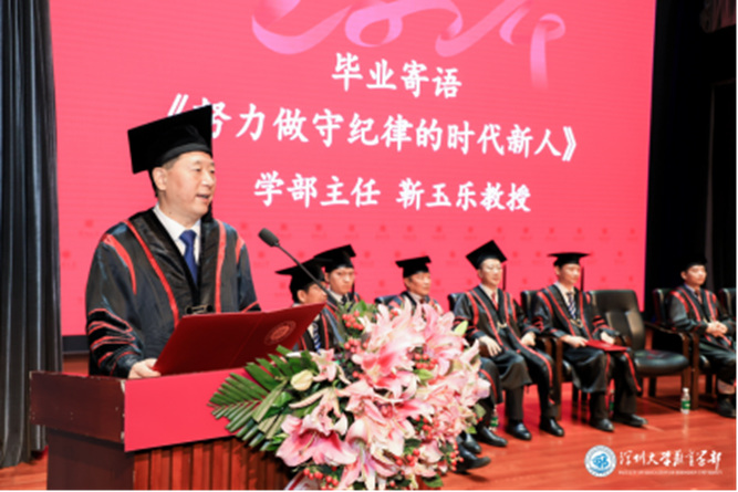 在致辞中,靳玉乐对即将启程的毕业生们表示最热烈的祝贺和最衷心的祝福,用《努力做守纪律的时代新人》给毕业生们上了毕业前的“最后一课”。他说,“欲知平直,则必准绳;欲知方圆,则必规矩。”人若有了规矩,能够做到守纪律,就能弄清楚该做什么、不该做什么,能做什么、不能做什么。深大校训中有“自律”的要求,一个人要有所成就,不能完全靠外部约束,要靠自觉自律。只有把遵规守纪刻印在心,内化为言行准则,进而形成遵规守纪的高度自觉,才能成为有理想、有本领、有担当的时代新人。最后,他嘱托每一位毕业生,要“把学习作为首要任务,作为一种责任、一种精神追求、一种生活方式,树立梦想从学习开始、事业靠本领成就的观念”,努力做守纪律的时代新人。