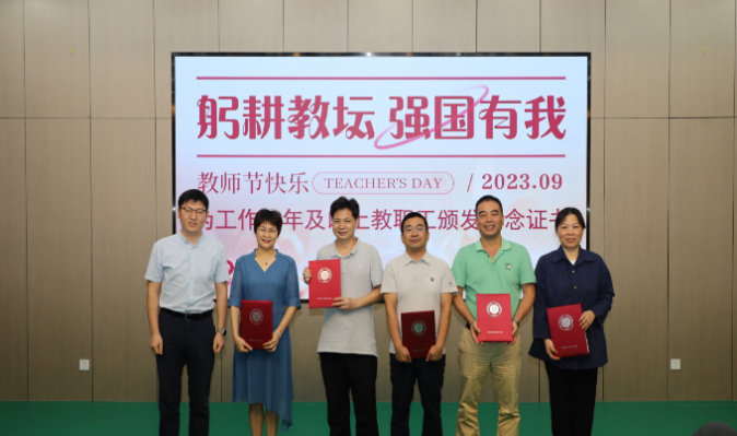 会上,赵明仁、曹晓明、李鹏虎为荣获工作三十周年的教职工颁发证书。