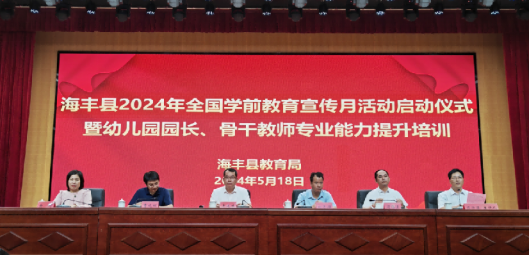 教师培训基地”牌匾。 接着,几位在主席台就坐的领导领导共同点亮启动器,海丰县教育局局长李建生宣布海丰县2024年全国第13个学前教育宣传月活动及幼儿园园长、骨干教师专业能力提升培训班正式启动。