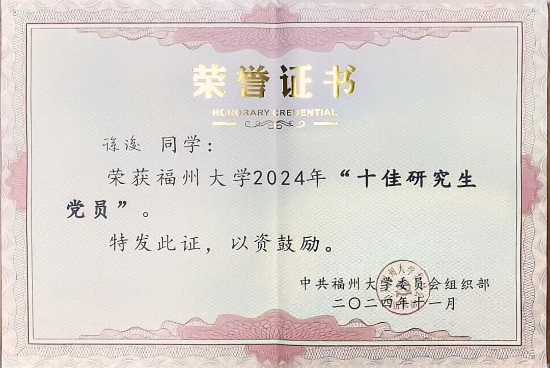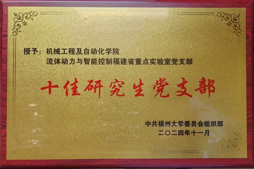 流体动力与智能控制福建省重点实验室党支部荣获“十佳研究生党支部”,2024级博士研究生徐浚同志荣获“十佳研究生党员”。